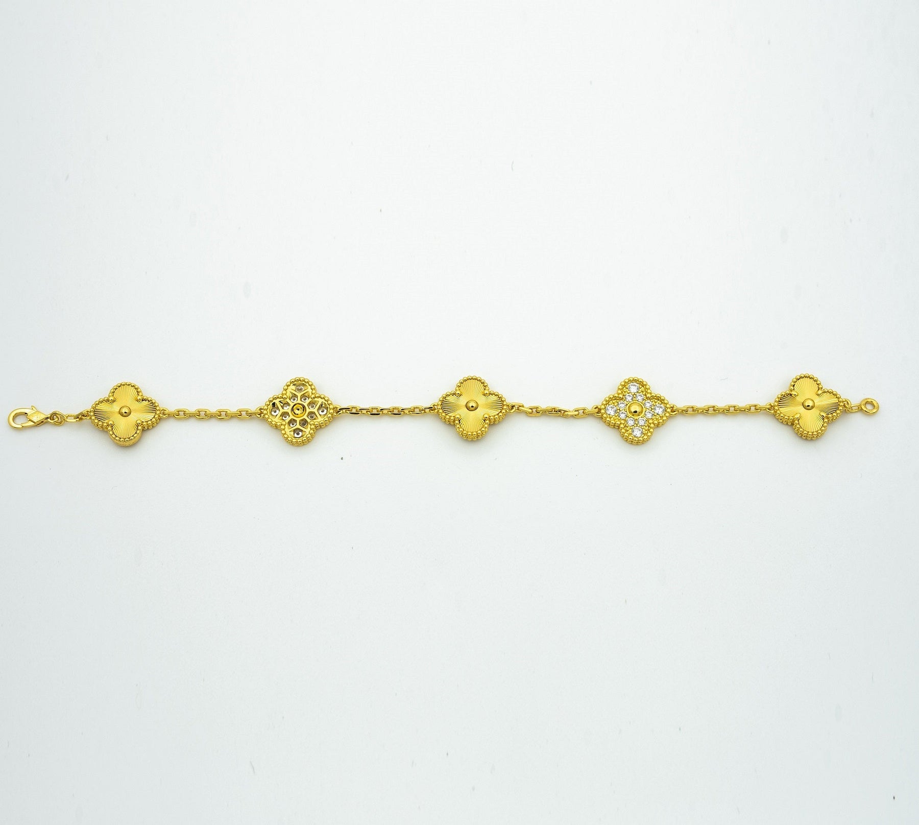 Klover 5 Motiver Gull Diamant Armbånd utstråler ren luksus og sjarm. Hvert kløvermotiv kombinerer polert gull med glitrende diamantdetaljer, symboliserer lykke, kjærlighet og tidløs eleganse.